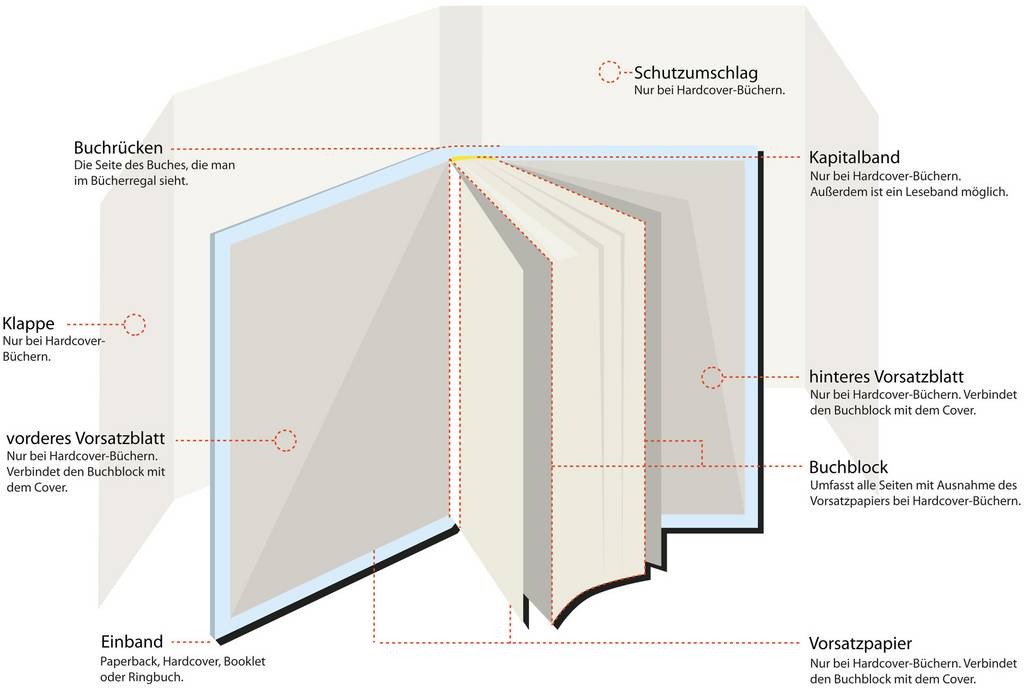 Du hast die Wahl, wie dein Buch aussehen soll. BoD bietet dir eine Vielzahl Ausstattungsvarianten, die du kombinieren kannst. Neben dem Text an sich hat auch die Ausstattung deines Buches einen großen Einfluss auf das Leseerlebnis. Damit dir die Auswahl für die passende Ausstattung deines Buches leichter fällt, verschaffen wir dir auf dieser Seite einen Überblick über die unterschiedlichen Bestandteile eines Buches und deren funktionaler sowie ästhetischer Bedeutung.